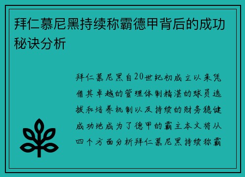 拜仁慕尼黑持续称霸德甲背后的成功秘诀分析